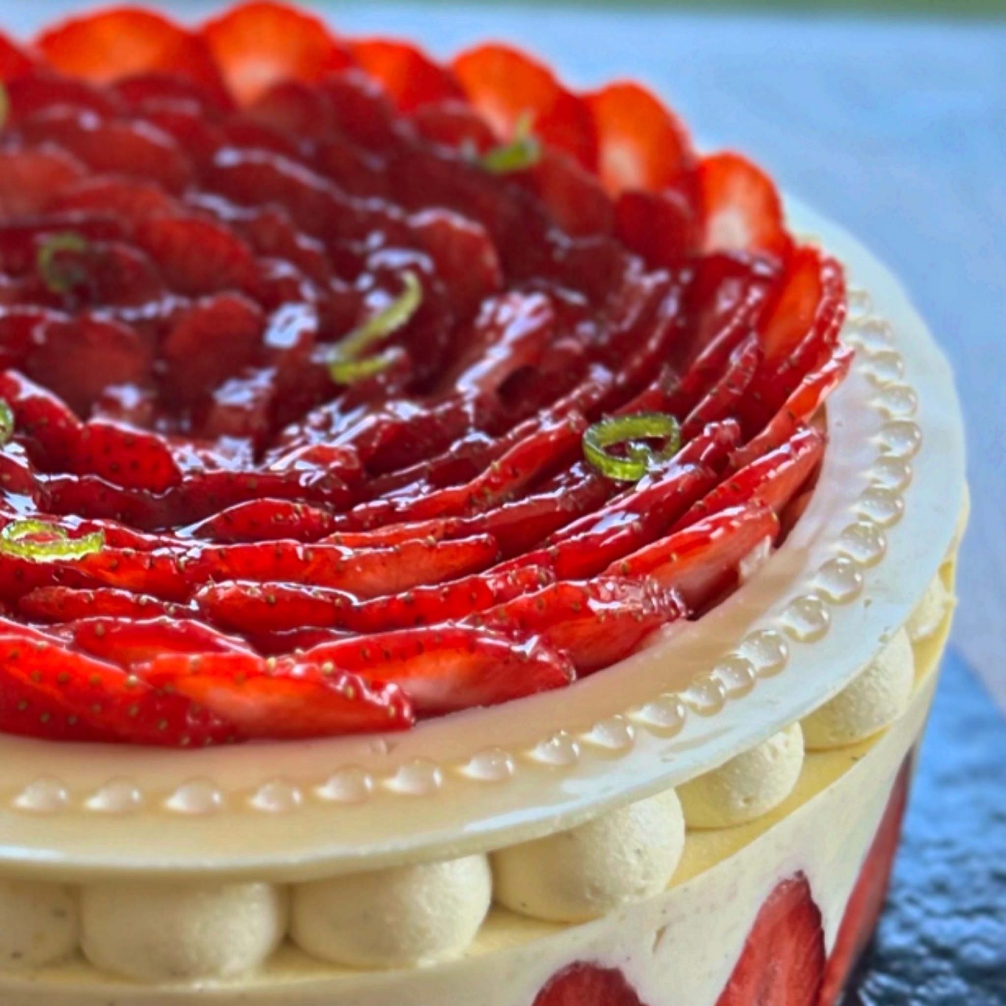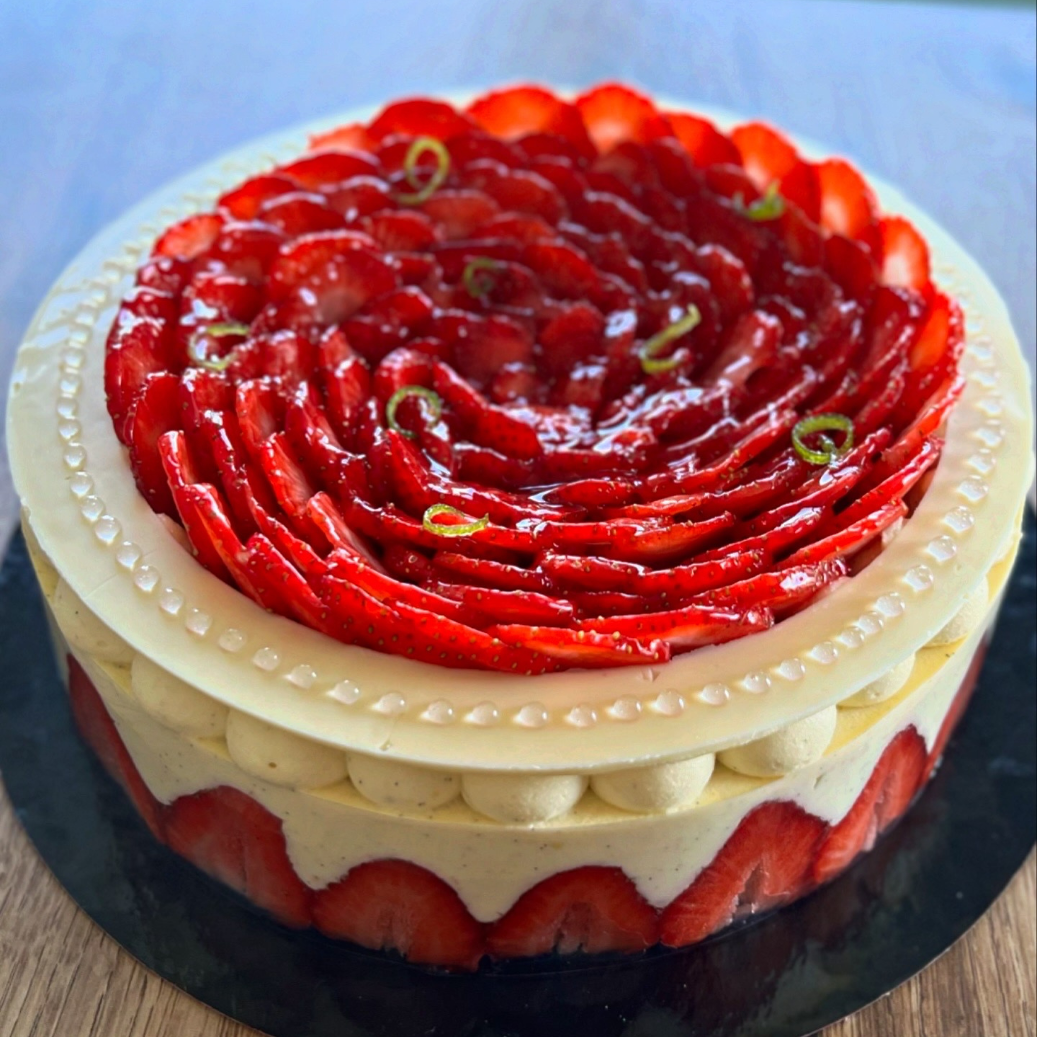 Genoise punché au citron vert, crème légère à la vanille et insert fraises, couronne de fraises