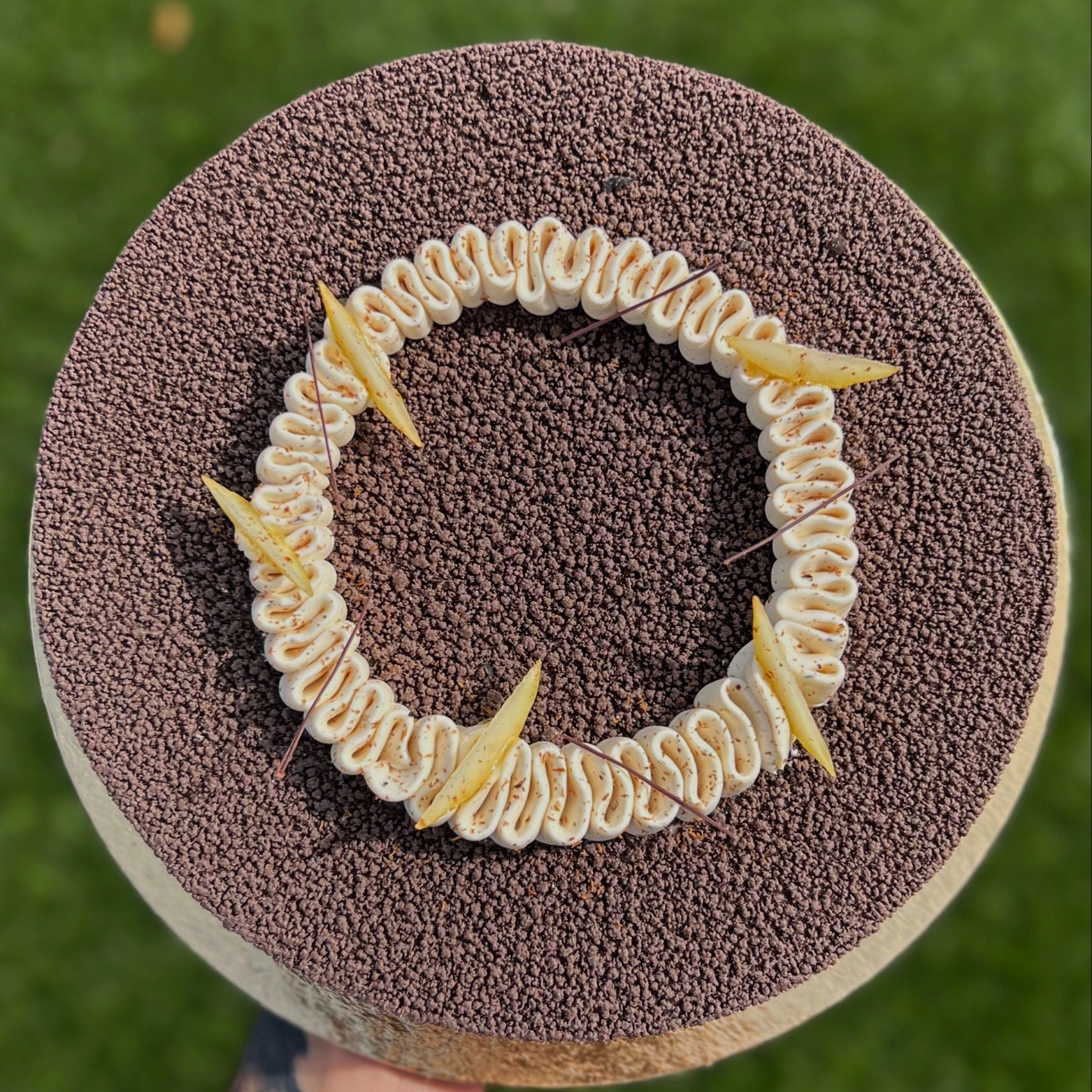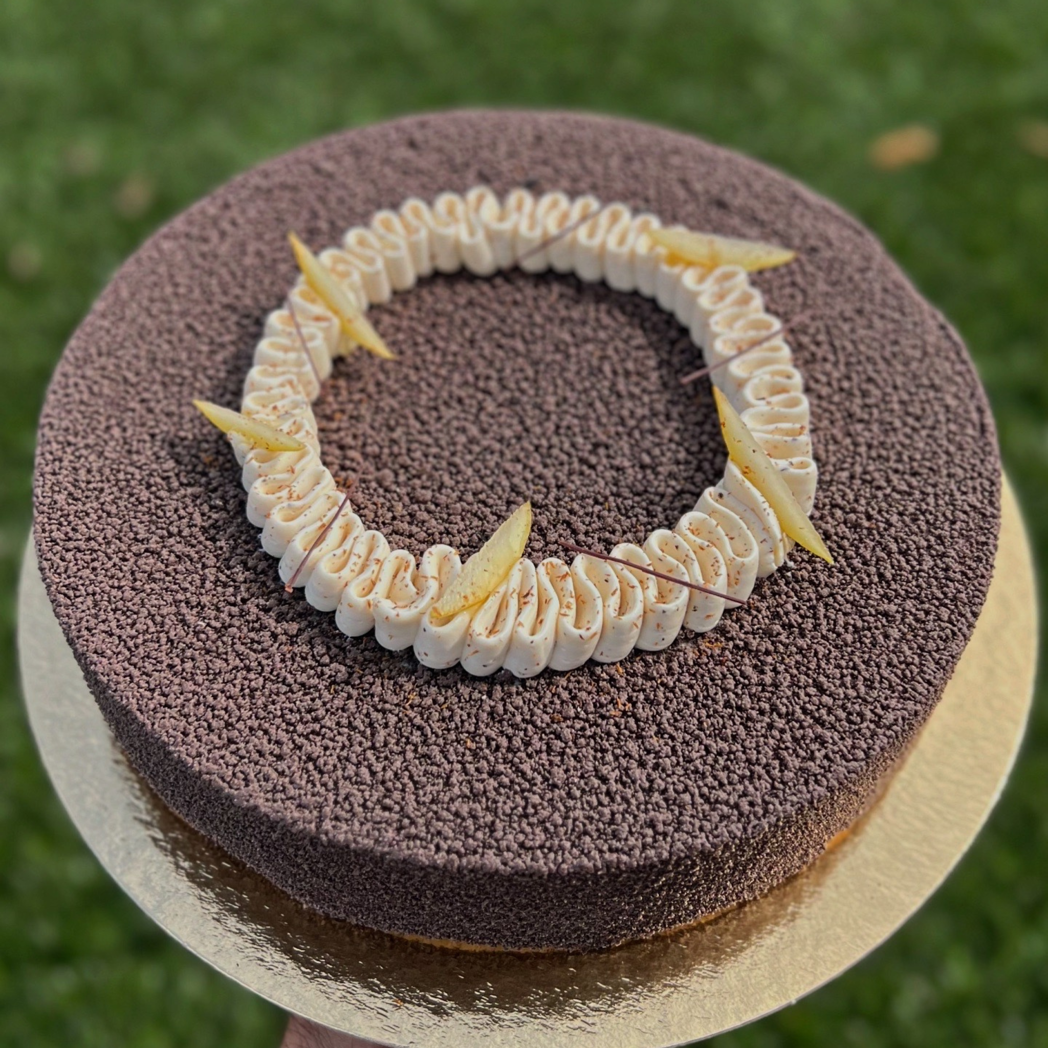 Biscuit dacquoise, croustillant praliné, crémeux chocolat noir 64%, glaçage miroir cacao brute
