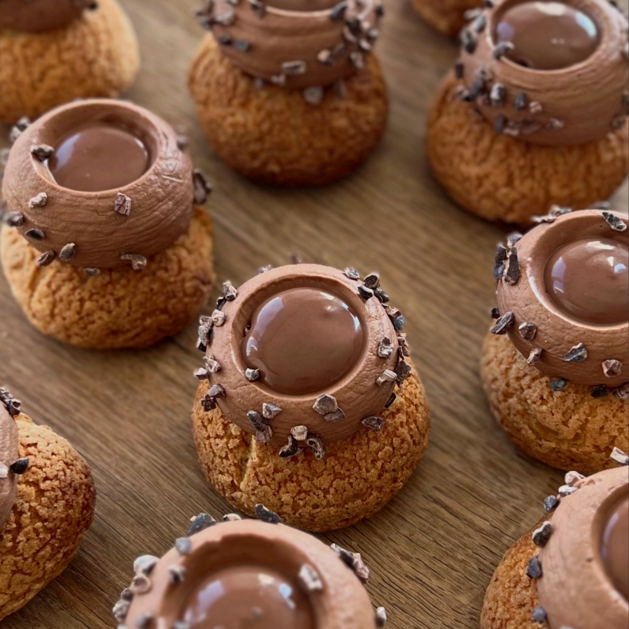 Pâte à choux et son craquelin, crème chocolat 64%, ganache montée chocolat et son coeur noir
